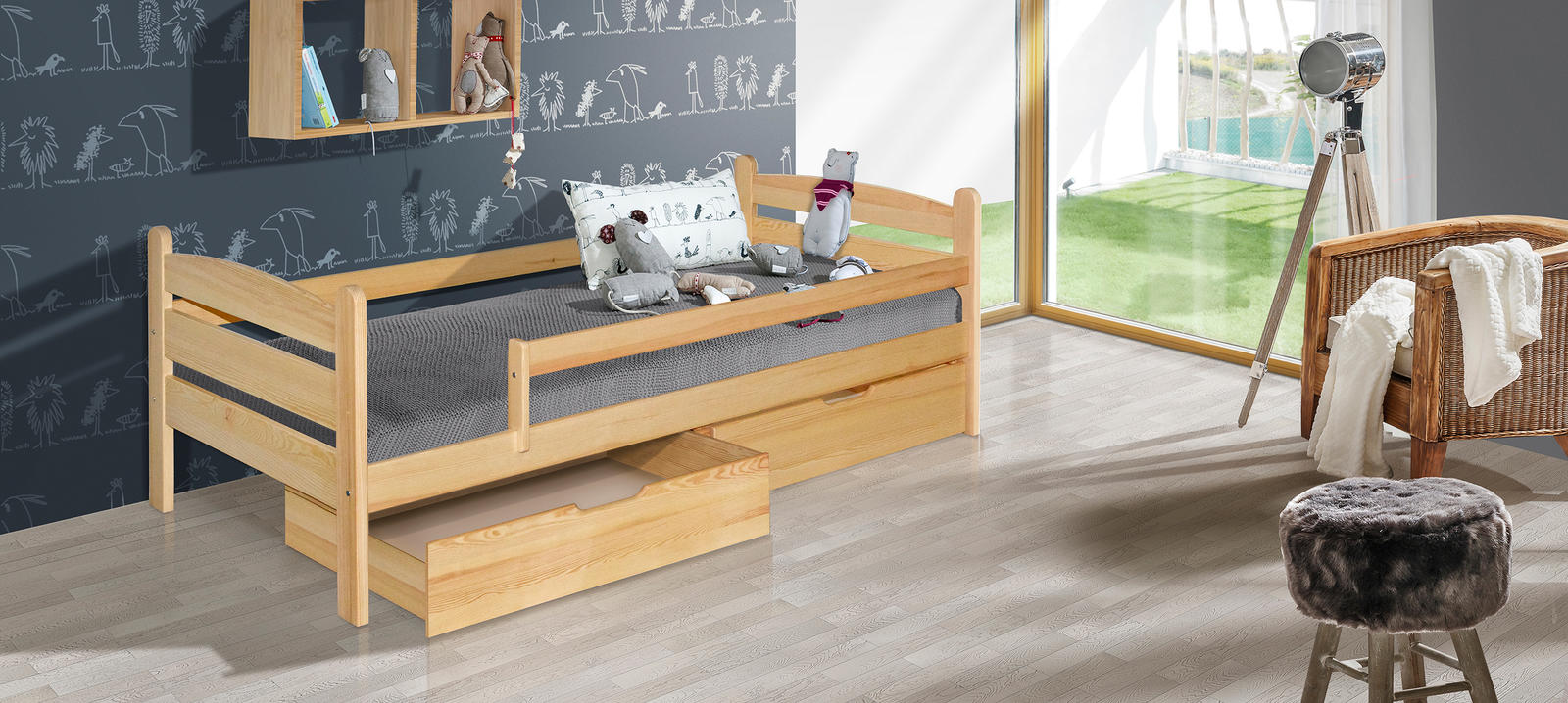 Vaikiška lova Mauricius su šoninėmis apsaugomis ir talpia patalynės dėže. Pagaminta iš tvirtos medienos, skirta saugiam miegui.