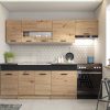 Tiesus virtuvės komplektas Alina su šviesaus medžio spintelėmis. Paprastas, funkcionalus dizainas mažesnėms ar klasikinių sprendimų virtuvėms.