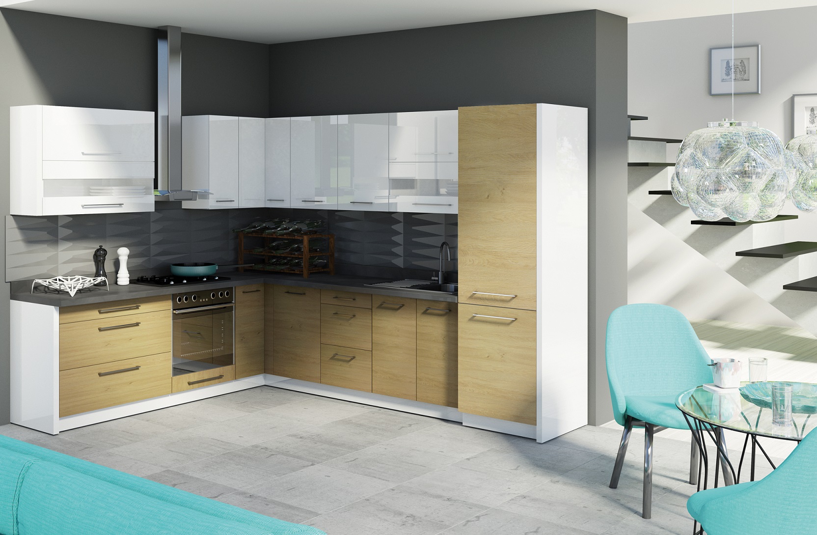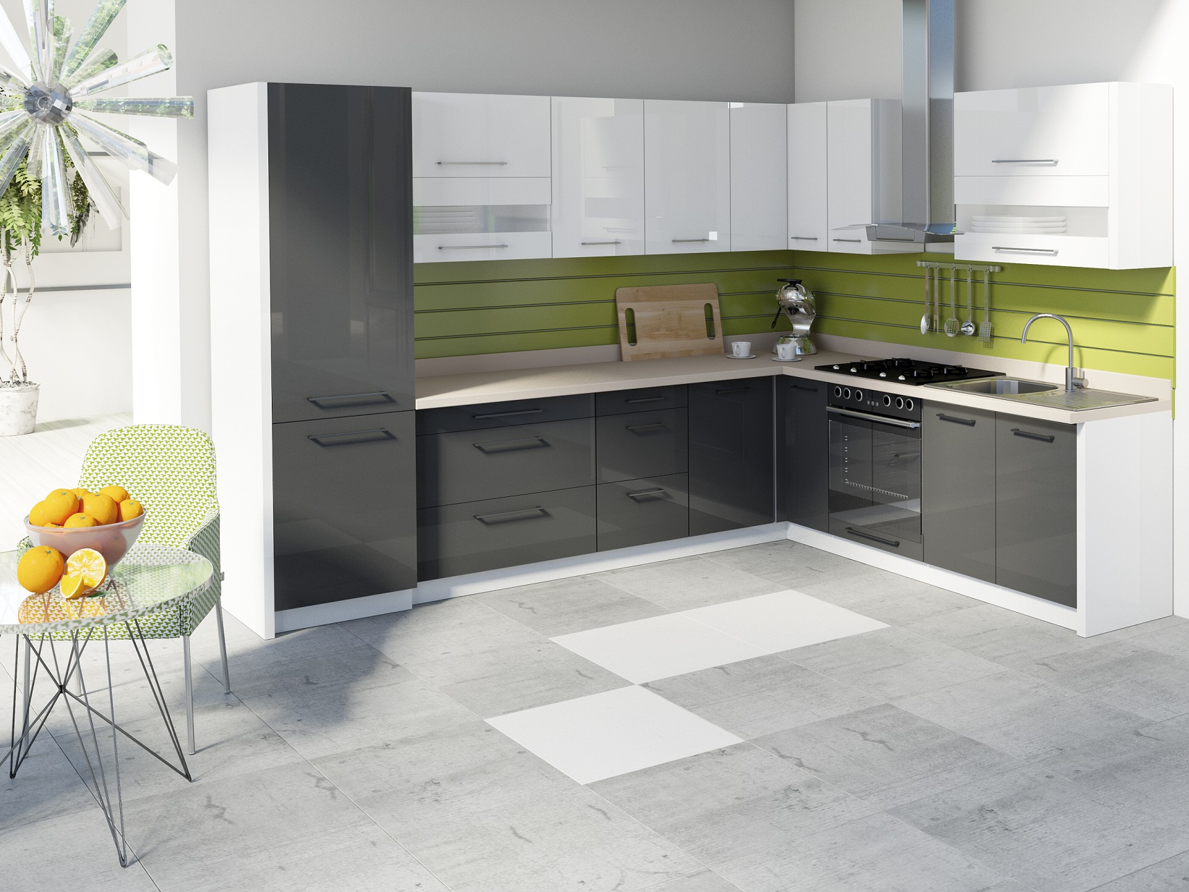 Virtuvės kolekcija Creativa – aukštos kokybės, naudojant aukščiausios klasės medžiagas, metalinės chromuotos rankenėlės, stalčiai su firmos HETTICH tylaus uždarymo sistema ir automatiniu pritraukimu, tylaus uždarymo lankstai Hafele , dujiniai pakėlėjai Blum.